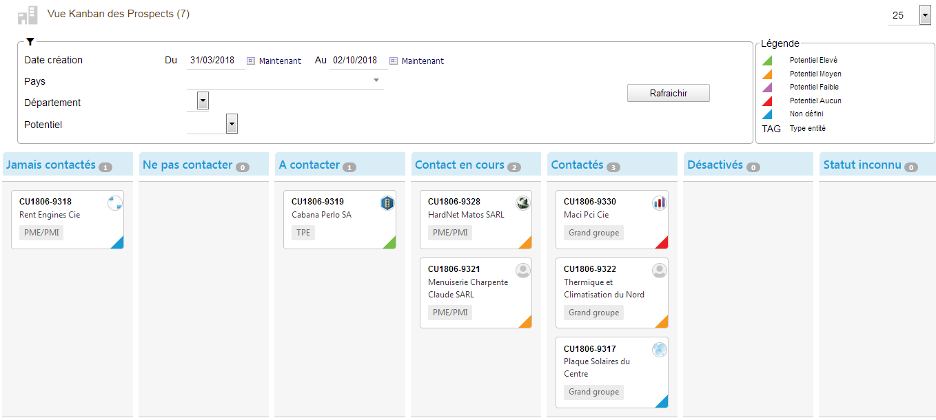 Les couleurs du coin inférieur droit pour les fiches Kanban des Prospects représentent les états :