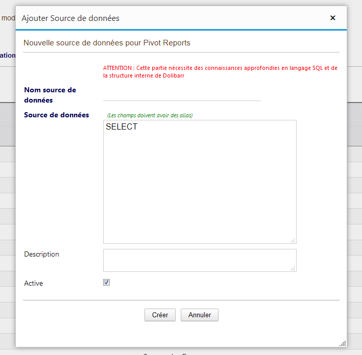 Dans la version actuel du module Pivot Reports, les données ne peuvent provenir que de requêtes SQL sur la base Dolibarr en cours d’utilisation.
