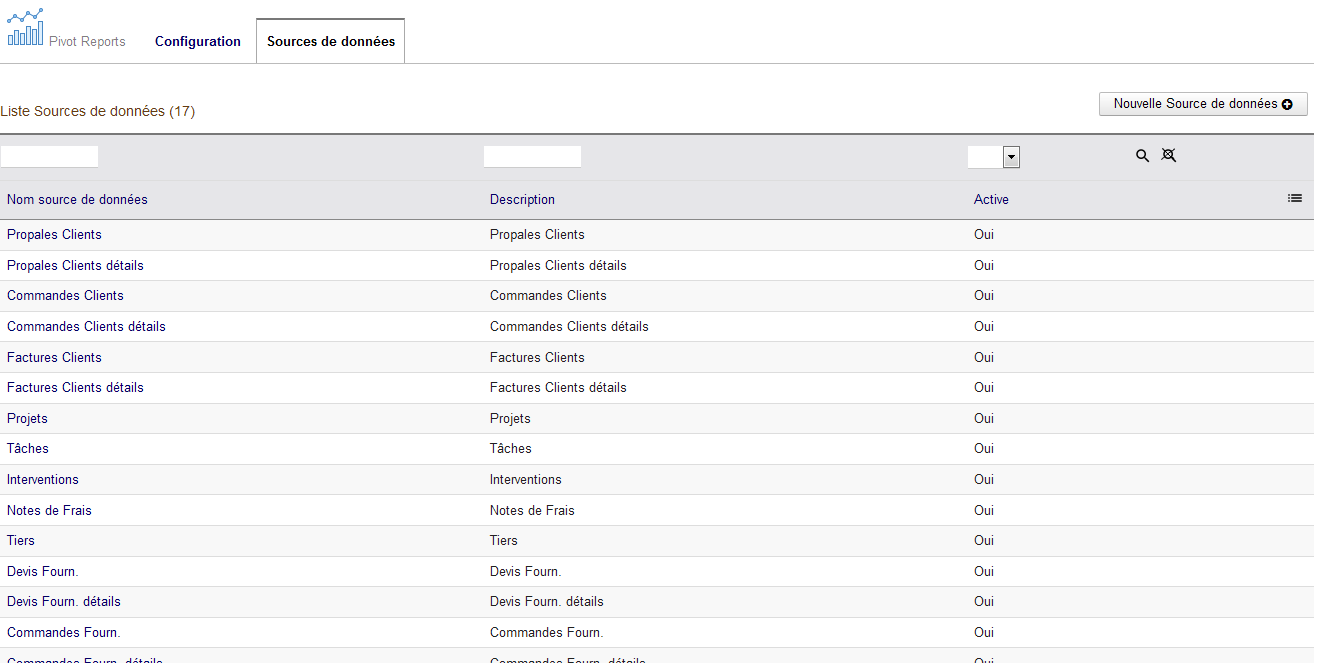 Le module Pivot Reports est fourni avec 17 sources de données prédéfinies couvrant la majorité des éléments Dolibarr (Devis, Commandes, …).