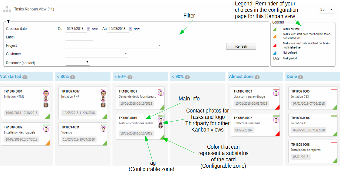 It allows to visualize the current states of these elements in columns and makes it possible to pass an element of a state to another by simple Drag & Drop from one column to the other when the Dolibarr business rules allow it.
