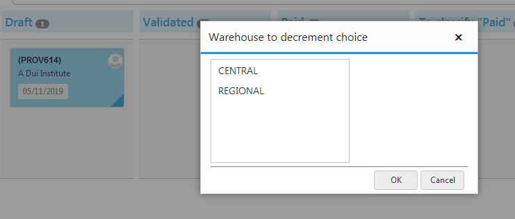 If the “Stock” module is activated in your Dolibarr and if the option “Increase real stocks on suppliers invoices/credit notes validation” is set to “Yes” then you will be prompted to choose the warehouse when you try to drag and drop from the “Draft” column to the “Validated” column: