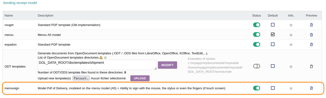 After activating the MerouSign module in the Modules / Applications list, you must also activate the “merousign” template added to the Shipments module (if not already done).