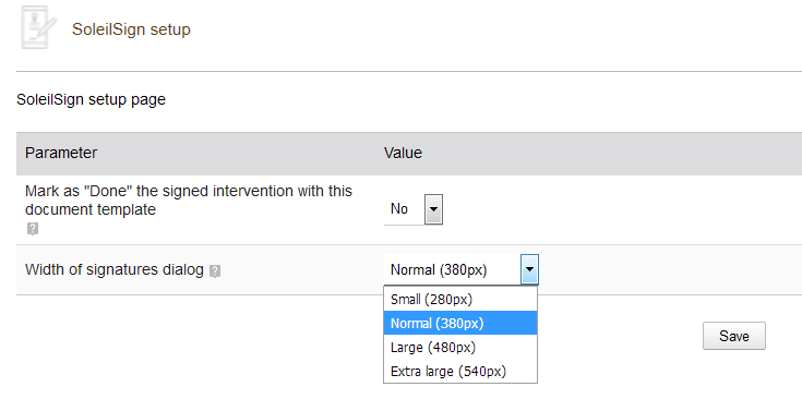 | SOLEILSIGN_ALWAYS_ALLOW_SIGNING | If equal to 1, you can sign an intervention whatever its state (draft, validated, …) | 0 |